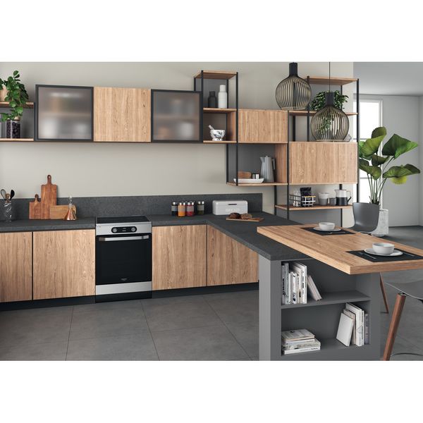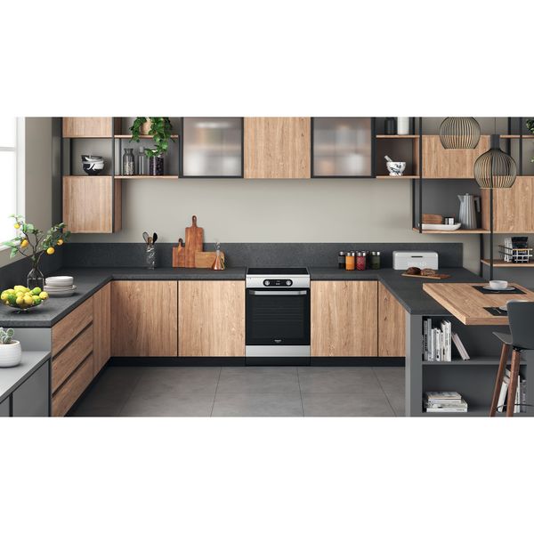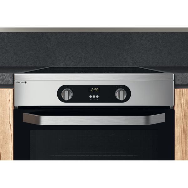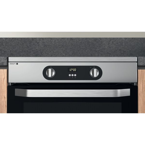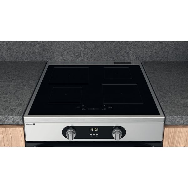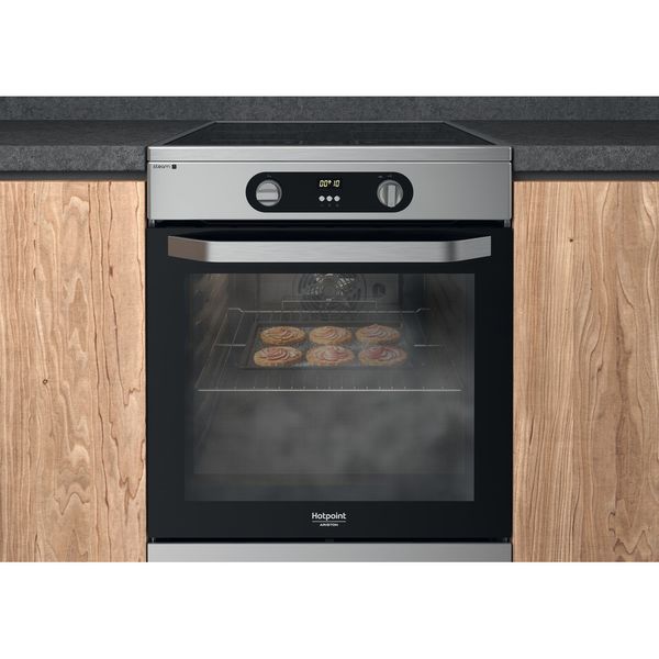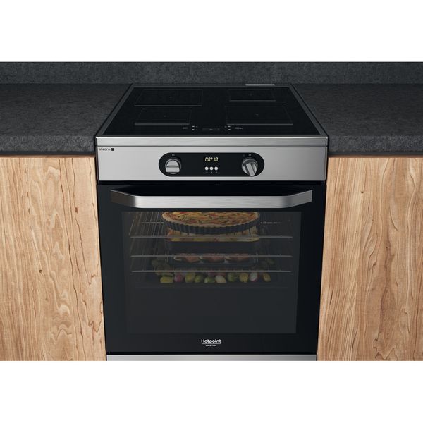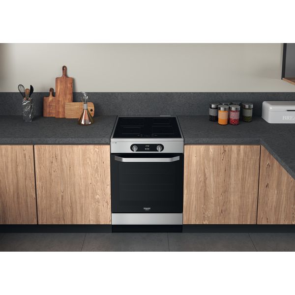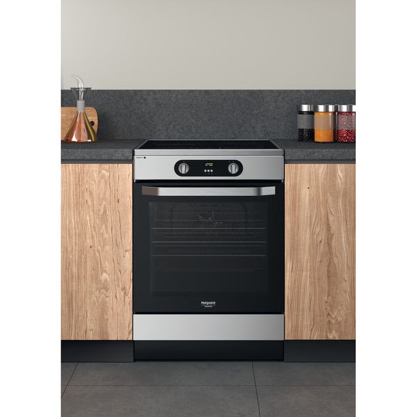 Cechy wolnostojącej kuchenki 60x60 Hotpoint: kolor inox. Zasilanie elektryczne. Wielofunkcyjna metoda gotowania. 60 cm szerokości.