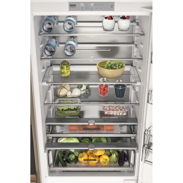 Cechy lodówko-zamrażarki do zabudowy Whirlpool: kolor biały. Wysokie urządzenie spełniające potrzeby całej rodziny. Szklane półki zapewniają wytrzymałość i elegancję. Wentylator zapewnia płynny i równomierny przepływ powietrza we wnętrzu urządzenia w celu zapewnienia udoskonalonej wentylacji. Czujniki 6-ty Zmysł automatycznie obniżają temperaturę w lodówce po włożeniu nowych produktów, zmniejszając zużycie energii.