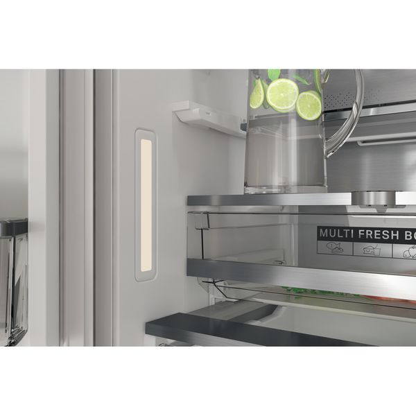 Cechy lodówko-zamrażarki do zabudowy Whirlpool: kolor biały. Szklane półki zapewniają wytrzymałość i elegancję. Wentylator zapewnia płynny i równomierny przepływ powietrza we wnętrzu urządzenia w celu zapewnienia udoskonalonej wentylacji. Czujniki 6-ty Zmysł automatycznie obniżają temperaturę w lodówce po włożeniu nowych produktów, zmniejszając zużycie energii. Praktyczna półka do bezpiecznego przechowywania butelek.