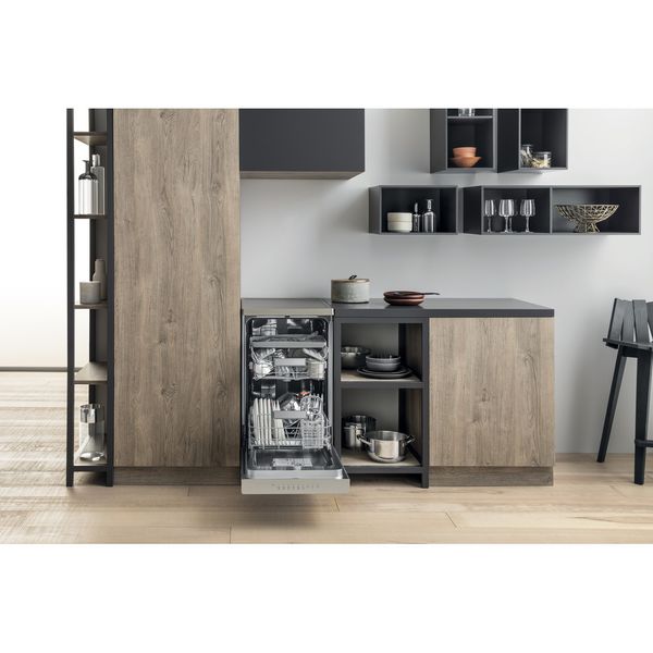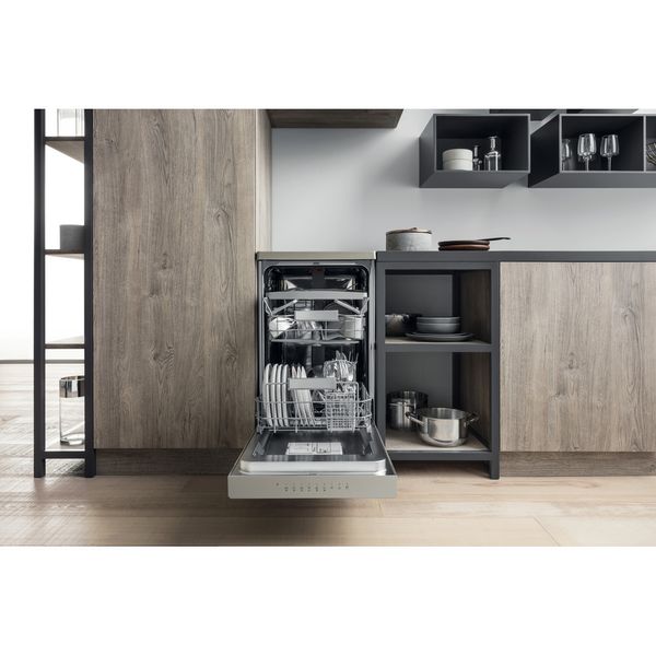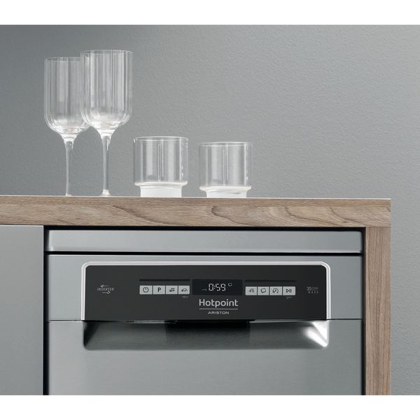 Cechy zmywarki Hotpoint: 45 cm szerokości w połączeniu z wyjątkową ilością ustawień oraz niewielkim i kompaktowym rozmiarem pozwalają cieszyć się niezbędną ilością miejsca, zarówno wewnątrz, jak i na zewnątrz urządzenia. Wyjątkowe, zmniejszone zużycie wody w połączeniu z oszczędzającym przestrzeń kompaktowym wzornictwem. Kolor inox. Innowacyjna technologia gwarantuje bardzo cichą pracę. Wygodny minutnik odmierzający czas do zakończenia cyklu zmywania.